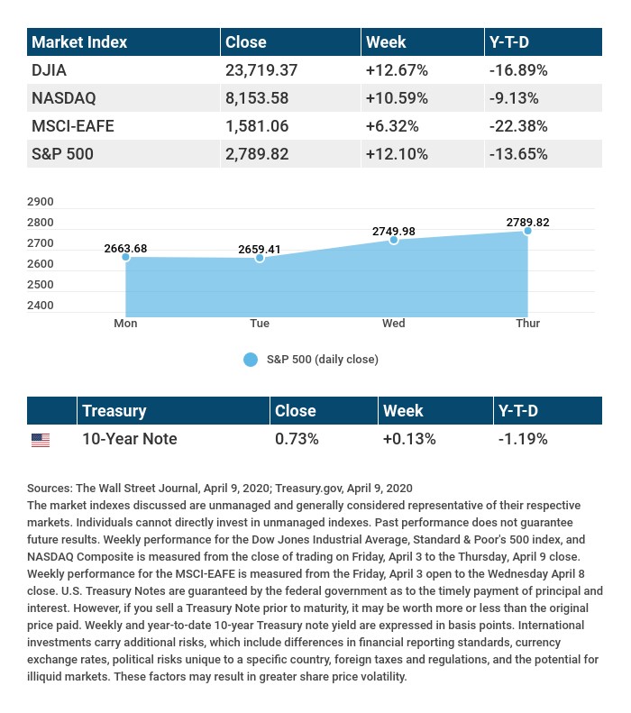 The S&P 500 Index surged 7.03% to start the week and added to gains as the week progressed. Positive trends in COVID-19 cases, an agreement between Russia and Saudi Arabia to cut oil production, and the Fed’s unveiling of a $2.5 trillion loan program to assist small and midsized businesses fueled the rally.4,5