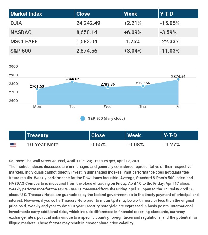 Stocks wavered throughout the week as investors digested the economic data and balanced the reports against signs that the pandemic may have peaked. With news of a plan to restart the economy and promising test results of a COVID-19 treatment, market sentiment turned positive, sending stocks higher on the final day of trading and cementing the second consecutive week of gains.