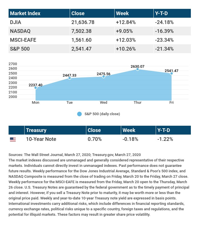 The Dow Jones Industrial Average jumped 12.84%, while the Standard & Poor 500 gained 10.26%. The Nasdaq Composite index rose 9.05% for the week. The MSCI EAFE index, which tracks developed overseas stock markets, increased by 12.03%.1-3