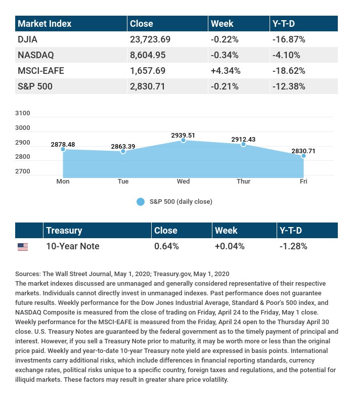 Stock prices ended the week slightly lower, despite news of positive results from a test trial of a COVID-19 drug treatment and several states easing their economic lockdowns.
